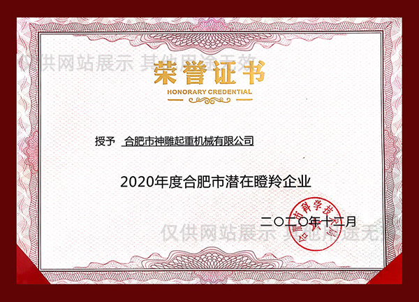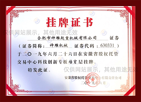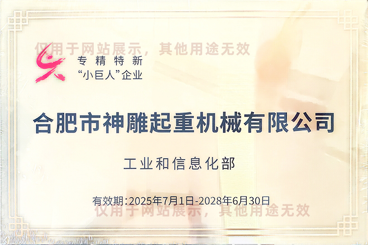 合肥神雕起重是高新技術企業(yè),是安徽省科創(chuàng)板掛牌企業(yè)(證券代碼:630331),同時榮獲安徽市場質量、誠信五星級企業(yè)、合肥經(jīng)濟圈示范企業(yè)、合肥市創(chuàng)新型企業(yè)、安徽省市場質量放心產(chǎn)品等榮譽稱號